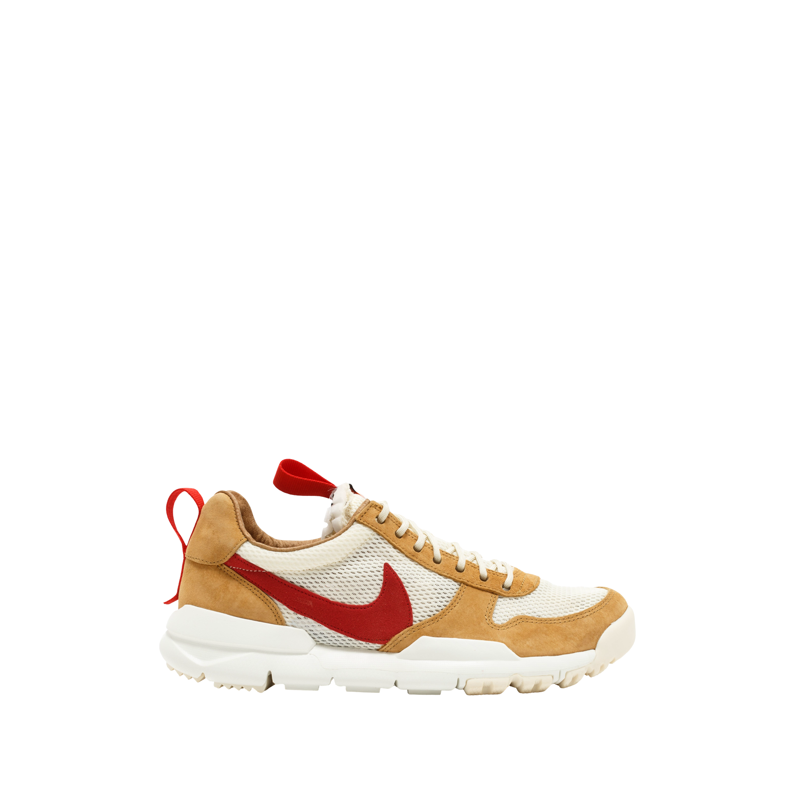 Issue du programme NikeCraft 2.0: MARS, la Tom Sachs x NikeCraft Mars Yard ‘Tom Sachs’ illustre l’alliance entre innovation technique et design expérimental. Sa construction en daim et Vectran se décline dans des teintes Maple et Natural, sublimées par un Swoosh Sport Red et des pull-tabs contrastants. Pensée pour résister aux usages quotidiens tout en affirmant une esthétique unique, elle repose sur une semelle Free modifiée, intégrant une mousse plus dense et un motif de traction renforcé. Fidèle à l’approche artisanale et conceptuelle de Tom Sachs, cette sneaker traduit une vision singulière du sneaker design et de l’innovation NikeCraft.